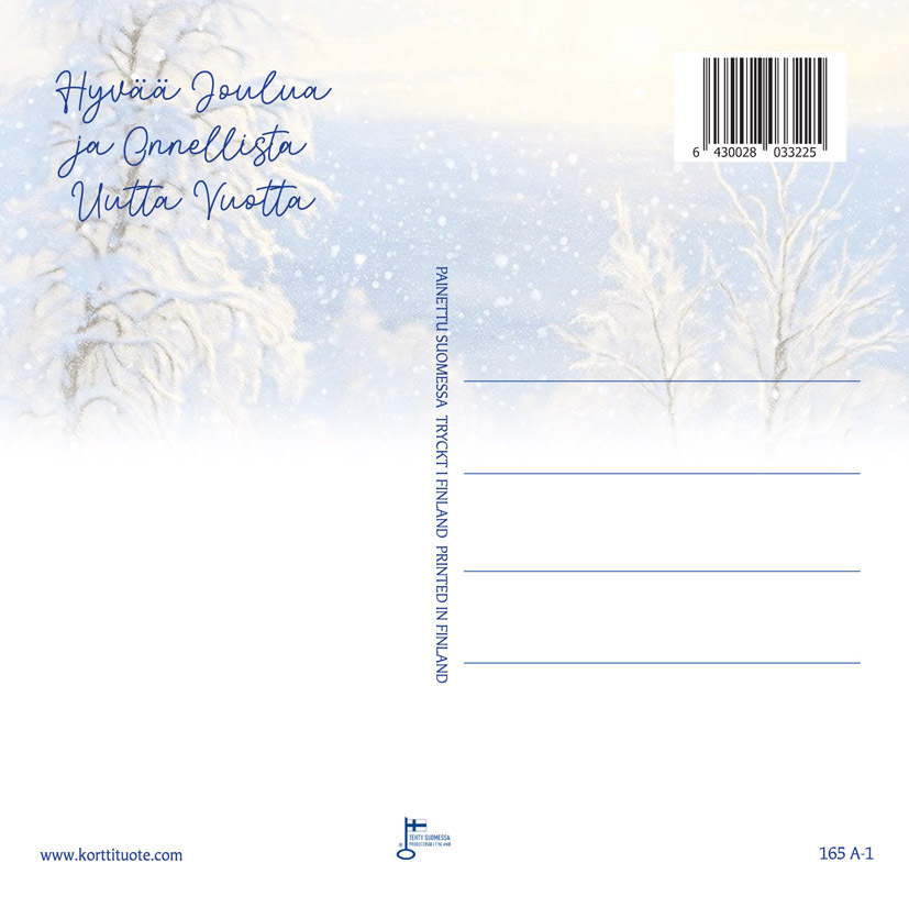 Maisemakortit sopivat erinomaisesti tervehdykseen, jossa haluat välittää rauhaa, hiljentymistä ja joulun kauneutta. Jokainen kortti on kuin pieni ikkuna talviseen Suomeen – näkymä, joka pysäyttää ja tuo joulun tunnelman lähelle, vaikka vastaanottaja olisi kaukana.