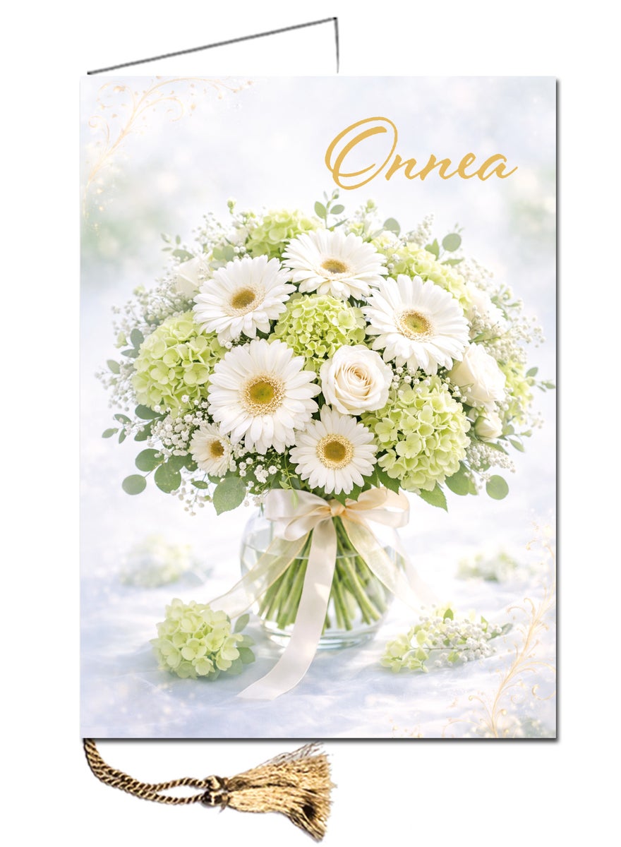 Onnitteluadressin koko on A4, mikä antaa tilaa kauniille ulkoasulle ja selkeälle viestille. Hintaan sisältyy aina kirjekuori, nyöri sekä sisälehti. Tilaa onnitteluadressi helposti verkosta, ja me huolehdimme lopusta.